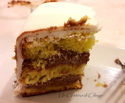 Realizzata su quattro piani: il primo, è una base in polistirolo, il secondo, è la torta preparata con pan di spagna e farcita con mousse alla nutella.