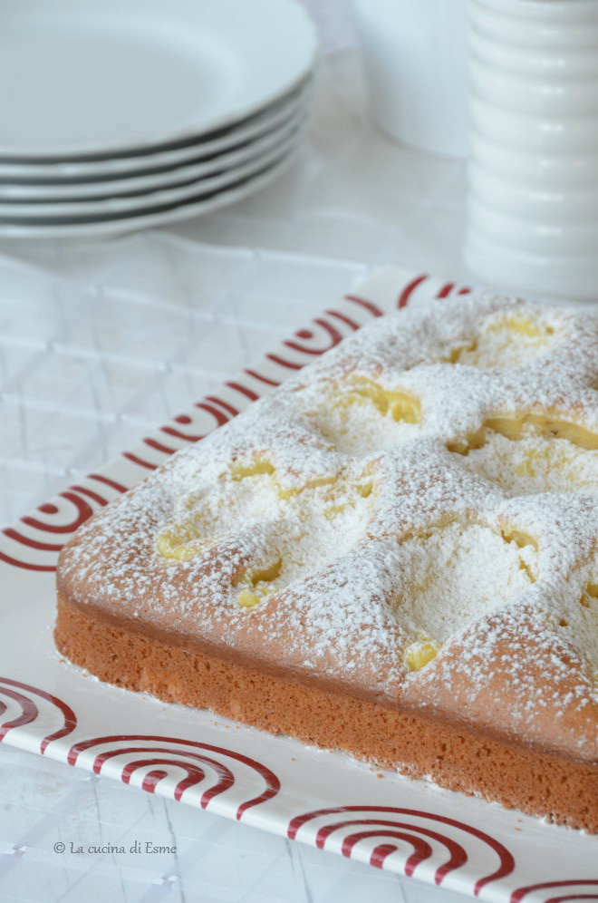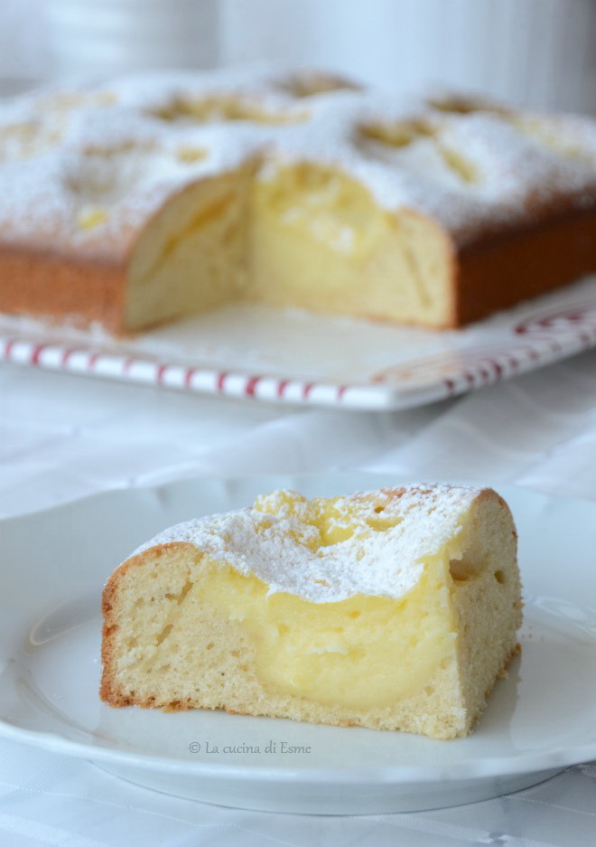 Eccomi qui, di nuovo obbligata a guardare la città dalla finestra …. bloccata in casa senza potermi muovere. Questa volta non c’entra nessun virus contagiosissimo, ma solo un problema personale che mi ha costretto, nei giorni scorsi, ad un piccolo intervento chirurgico e che ora mi blocca in casa per una lunga convalescenza. Mentre scrivo questo post, sono comodamente nel mio letto con una meravigliosa musica di sottofondo e con entrambe le finestre aperte, quindi con una visione ampia del verde che mi circonda e di un bellissimo cielo azzurro, che però mi fa salire la rabbia di non poter uscire. Che strano periodo quest’anno, anche il meteo mi rema contro, prima durante il lockdown un tempo meraviglioso, poi quando finalmente le porte si sono riaperte … temporali a gogò, ora che sono di nuovo impossibilitata ad uscire il tempo è meraviglioso, cielo terso e temperatura perfetta! Mah, lasciamo perdere, forse è meglio parlare di ricette … qualche giorno fa ho preparato questo dolce delizioso, soffice e profumato. Una ricetta semplicissima, che si prepara velocemente e garantisce un risultato sorprendente. La torta Nua con crema pasticciera che non affonda, è ormai un classico del web, io personalmente la preparo spesso, ma mi sono accorta solo ora di non averla mai pubblicata. La sua cremosità, unita all’estrema semplicità della preparazione vi conquisteranno. Solamente un consiglio, per una riuscita perfetta ricordatevi di preparare la crema pasticcera il giorno prima, così da utilizzarla soda e ben fredda.