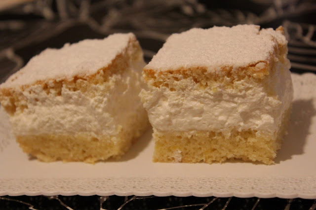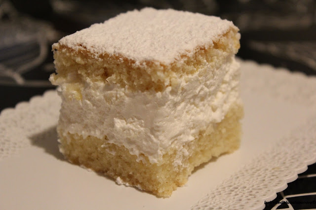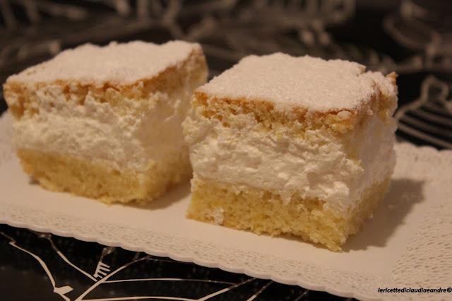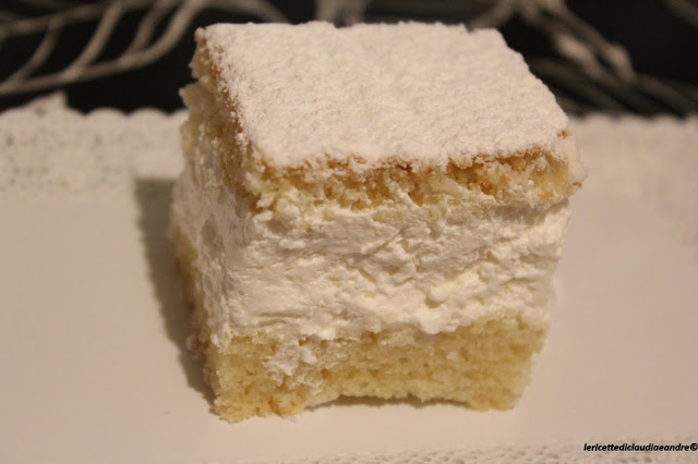 Questo dolce lo avevo fatto più volte ed è stato sempre gradito, sia nella versione rettangolare, la torta paradiso tonda, ma non poteva mancare anche a quadratini. Ecco come al solito, se si fa di corsa, non tutto riesce bene. Doveva essere farcita con la panna da montare fresca e con 2 cucchiai di miele, ma qualche volta la panna fa brutti scherzi, sopratutto quando ci tieni a fare le cose per bene, ma niente panico, si fa come si può, e si va avanti con i preparativi come niente fosse. In questo modo ho dovuto sostituire la panna fresca con quella già zuccherata perché l’altra l’avevo finita, ma è venuta altrettanto buona, è stata ben gradita da tutti gli ospiti….