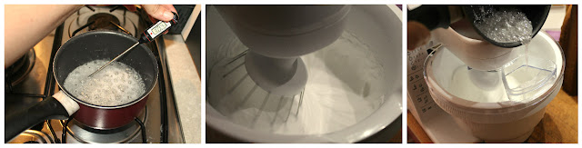Quando l’albume sarà ben montato e lo sciroppo pronto versatelo nella planetaria in movimento a filo lentamente e procedete a montare il tutto finchè la meringa non si staccherà dalle pareti è diventerà molto compatta tanto da restare nel gancio a frusta, raffreddandosi completamente. Ci vuole tempo!
