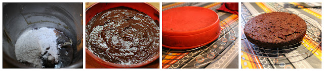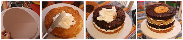 Sistemate un disco di cartoncino sul tornio o sul piatto e adagiate sopra la prima torta, nel mio caso una chiara con centro al cacao, ma è indifferente. Ricopritela con un po’ di meringa aiutandovi con una spatola, appoggiate sopra una torta scura e procedete fino ad esaurimento delle torte.