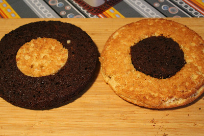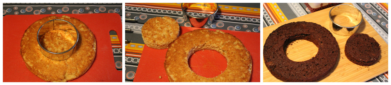 Ora la parte divertente, con un taglia pasta tagliate un cerchio al centro di ogni torta ricavando una ciambella e una tortina piccola.