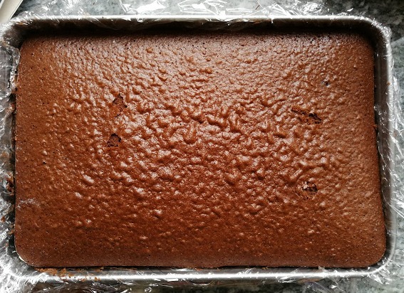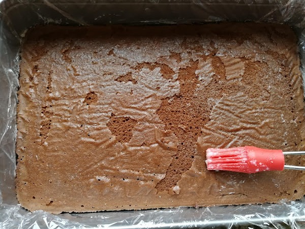 Ora foderare lo stampo con pellicola trasparente e pennellare la superficie della prima torta con 50 gr di latte condensato mescolato con 50 gr di acqua..