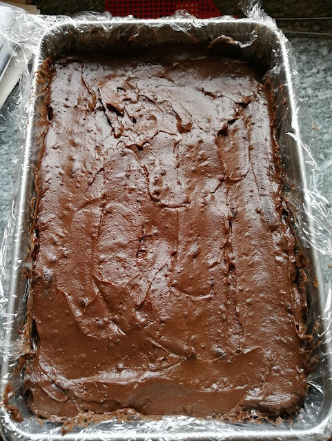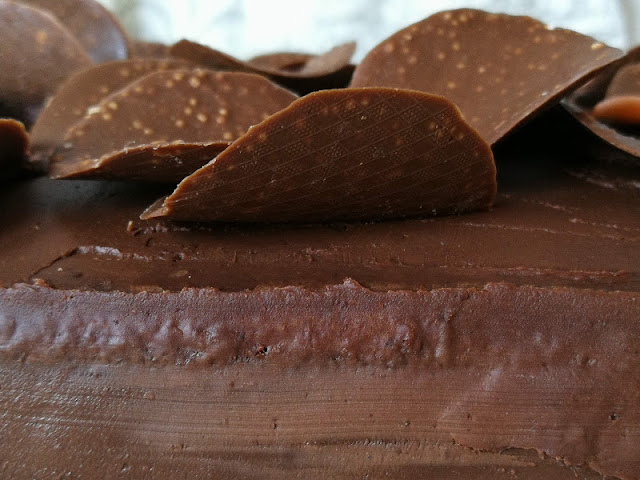 Ora trasferire su un piatto da portata e versare sulla superrficie la ganache ottenuta fondendo il cioccolato con la panna e fatto raffreddare.