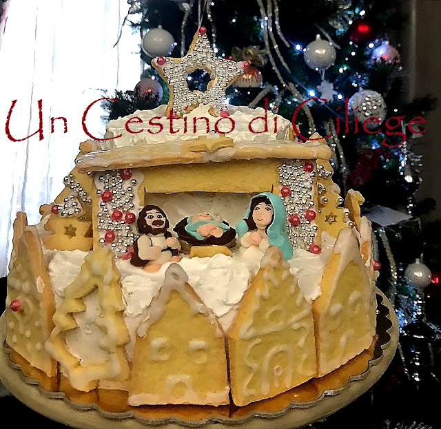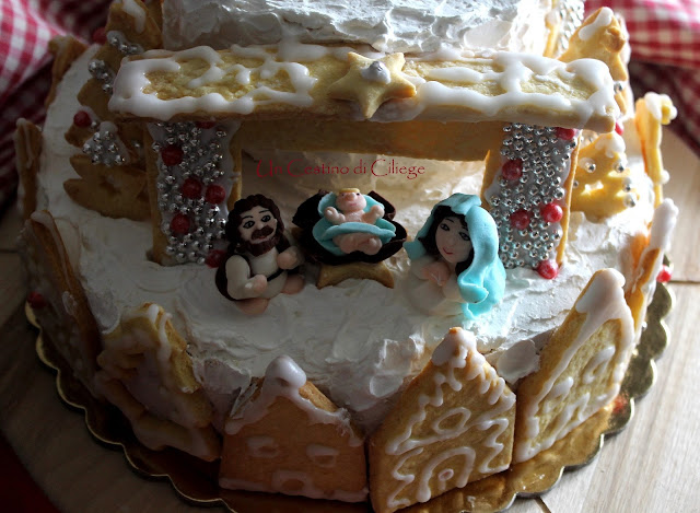 Torta presepe, realizzata con pan di spagna farcito con mousse alla nutella e decorata con biscotti.