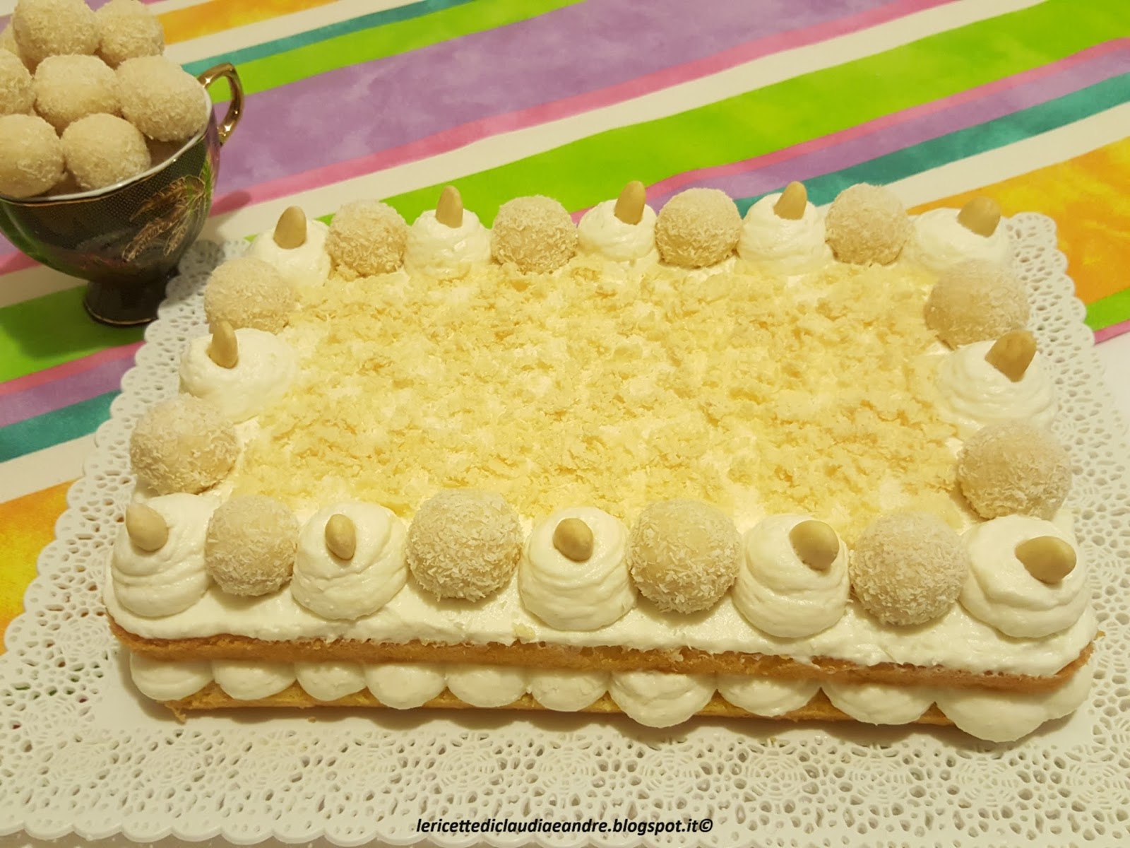 - Spalmare uno strato di crema, decorare con dei bon bon Raffaello preparati in precedenza, con dei ciuffetti di crema e con delle mandorle sopra i ciuffetti e un pò di wafer sbriciolato al centro, tutto a piacere