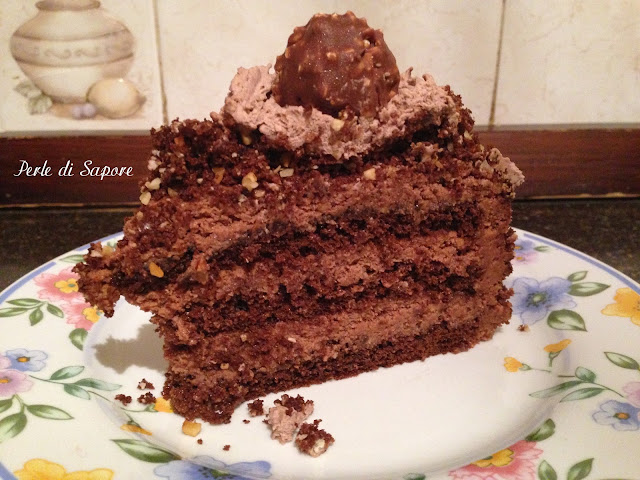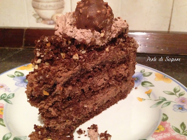 Montate la panna, aggiungete il cacao amaro e lo zucchero, e mescolate (dal basso verso l’alto) per amalgamare gli ingredienti e ottenere un colore uniforme. Trasferite la panna nella sac à poche e create dei ciuffetti sulla superficie della torta. Il numero dei ciuffetti da fare dovrà essere pari a quanti Ferrero Rocher volete utilizzare per la decorazione (io ho realizzato 8 ciuffetti per 8 Rocher).