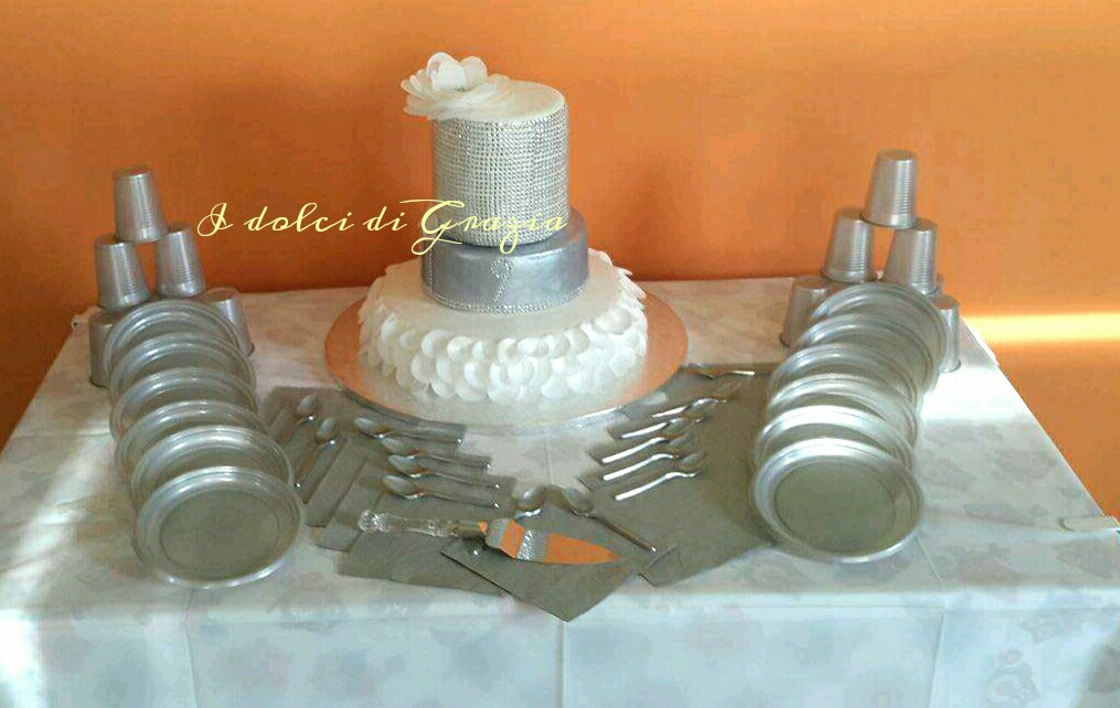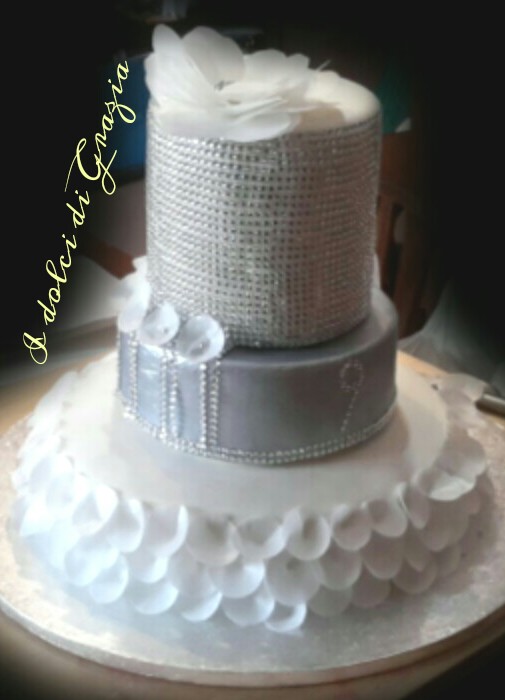 Solo il piano alla base della torta è edibile, i piani superiori sono in polistirolo rivestito di pasta di zucchero e lì, visto che non c’era nulla da addentare, mi sono sbizzarrita con decorazioni in ostia e strass.