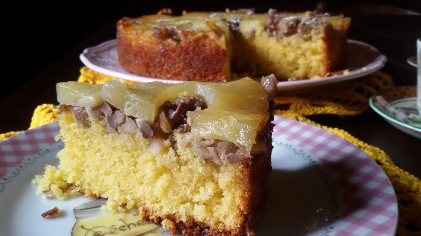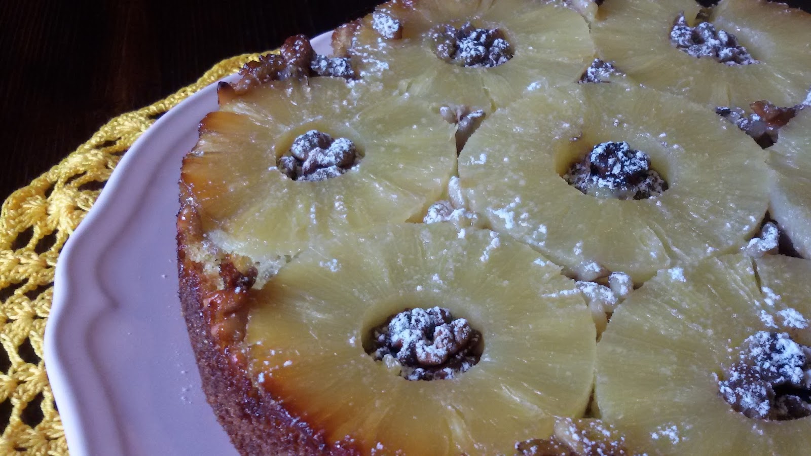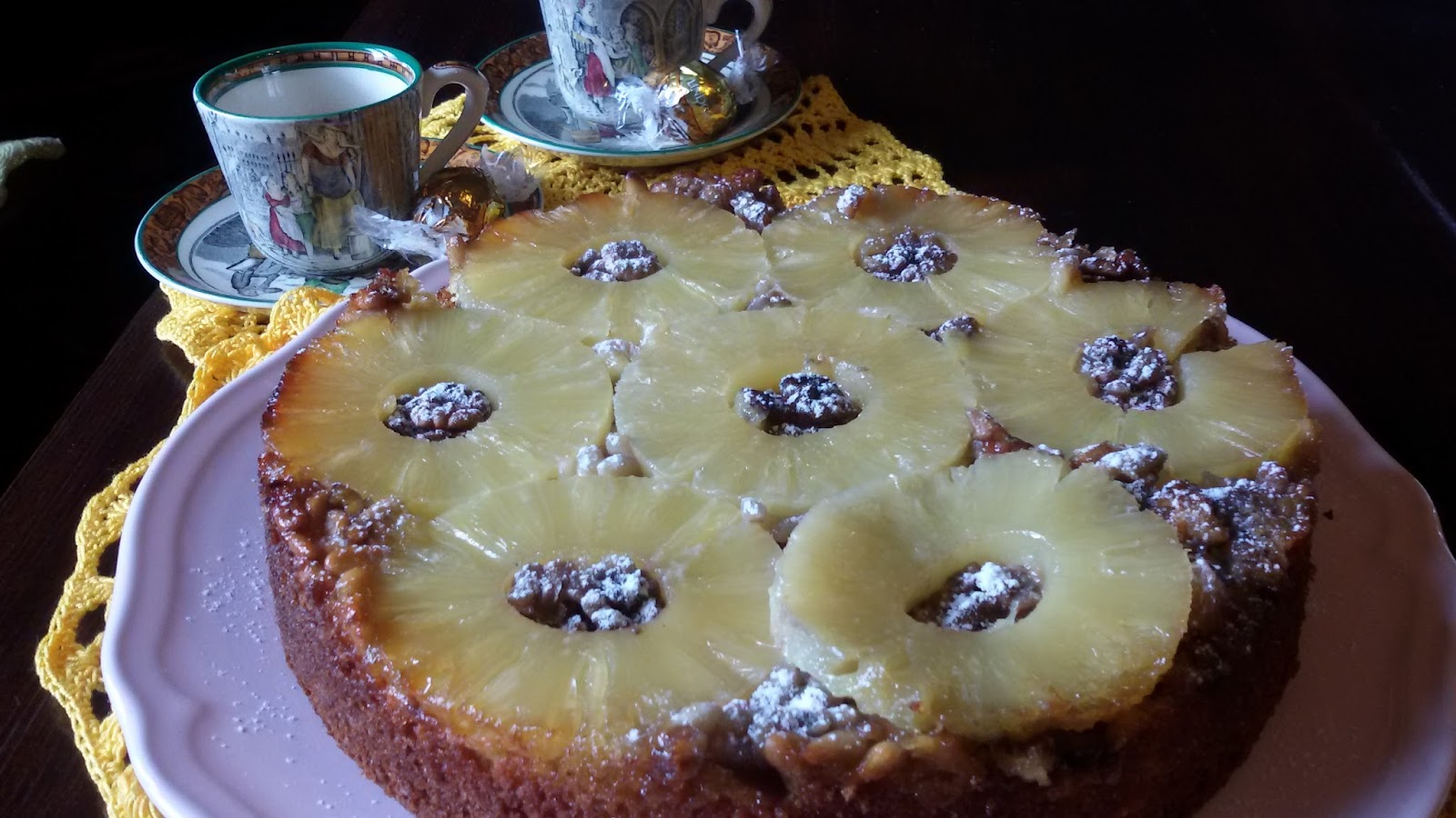 Però qualche ricetta da provare ce l’ho e ho cominciato da questa, non amo particolarmente i dolci con la frutta (cotta) ma questa TORTA ROVESCIATA ALL’ANANAS CON NOCI E PINOLI mi ispirava davvero tanto ed eccola qua.