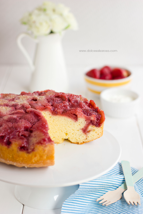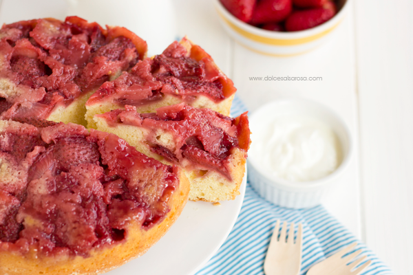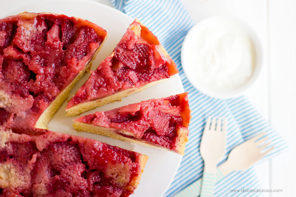 Il tocco in più: è una torta rovesciata, quindi basta preparare l’impasto della torta allo yogurt e versarlo nello stampo dove avrete precedentemente preparato il caramello e disposto le fragole a pezzetti.