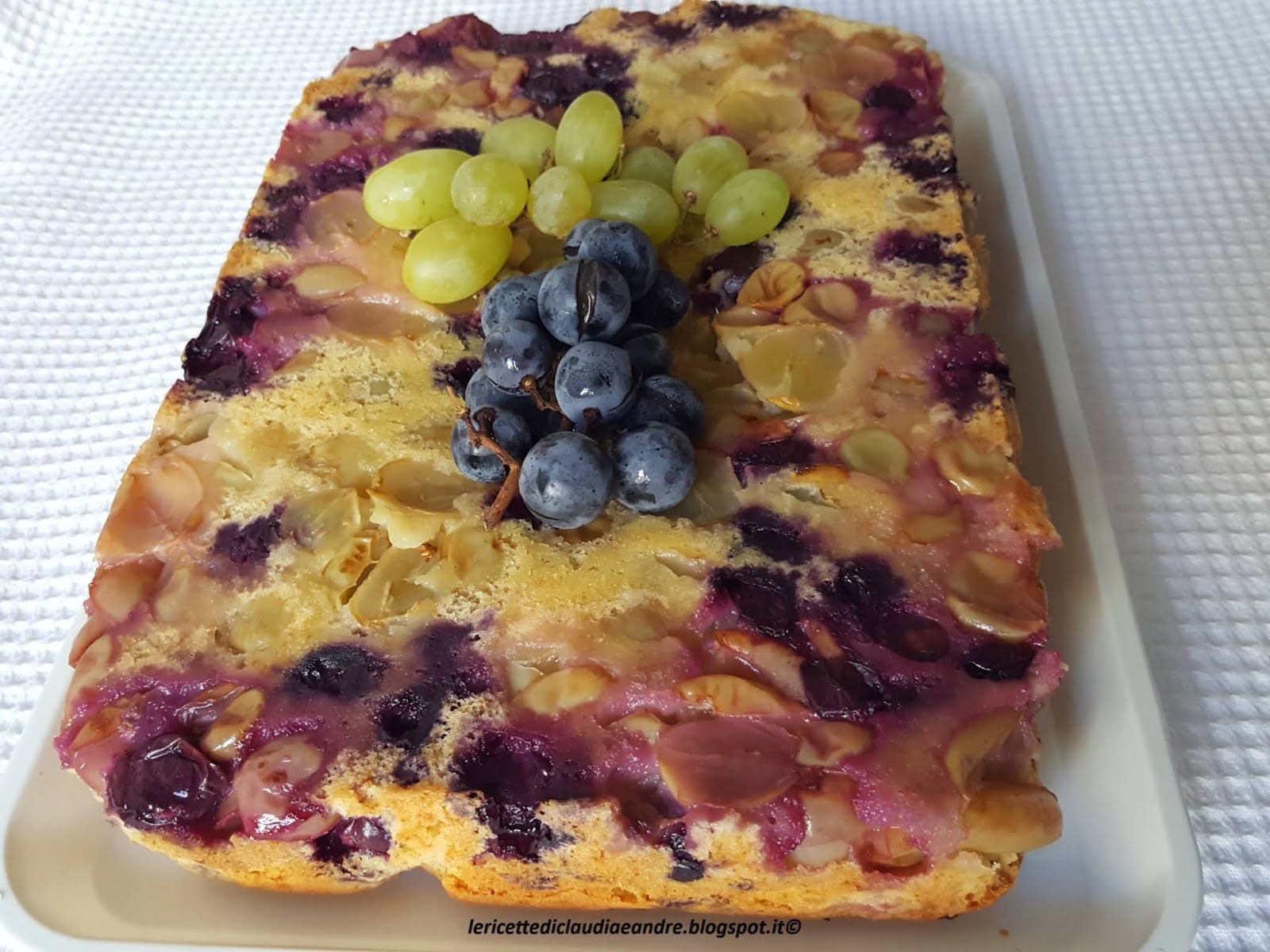 - Foderare una teglia da 27 x 17,5 cm, distribuire sotto il misto d’uva bianca e fragolina, rovesciare il composto e livellare.