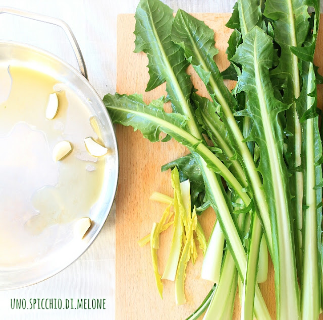 Iniziate con saltare in padella con olio, sale grosso e qualche spicco d’aglio la cicoria lavata e tagliata a pezzetti.