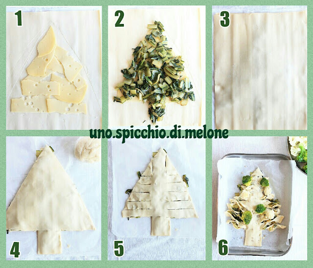 Ora stendete il primo rotolo, lo farcite col formaggio facendo la sagoma dell’albero. Aggiungete la cicoria e l’altro rotolo di pasta sfoglia.