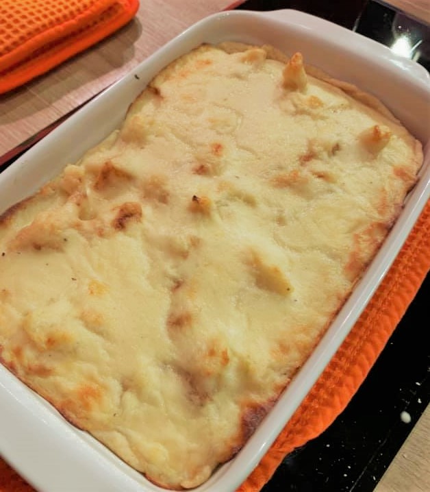 Far cuocere il cavolfiore in acqua fredda salata per 10 minuti da quando inizia a bollire. Intanto preparare una sorta di besciamella con latte e panna messi a scaldare insieme, aromatizzati con sale e noce moscata.