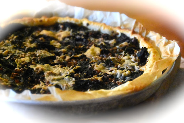 - Prendiamo un rotolo di pasta sfoglia (meglio ancora se la prepariamo in casa noi, tempo permettendo…), foderiamo una tortiera circolare, bucherelliamo il fondo con i rebbi della forchetta e adagiamo il composto di cavolo riccio, legumi e uova.