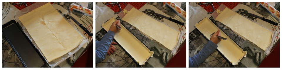 Srotolate la pasta sfoglia e tagliatela a metà per lungo. Ritagliate un rettangolo di carta forno grande quanto il fondo della tortiera e sistemato al suo interno. Ora trasferite metà della pasta sfoglia all’interno della teglia e modellate la con le dita per farla aderire bene ai bordi. Tagliate con un coltellino se per caso c’è un eccedenza di pasta.
