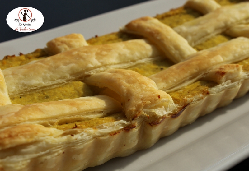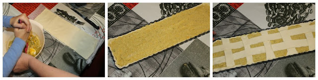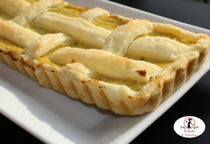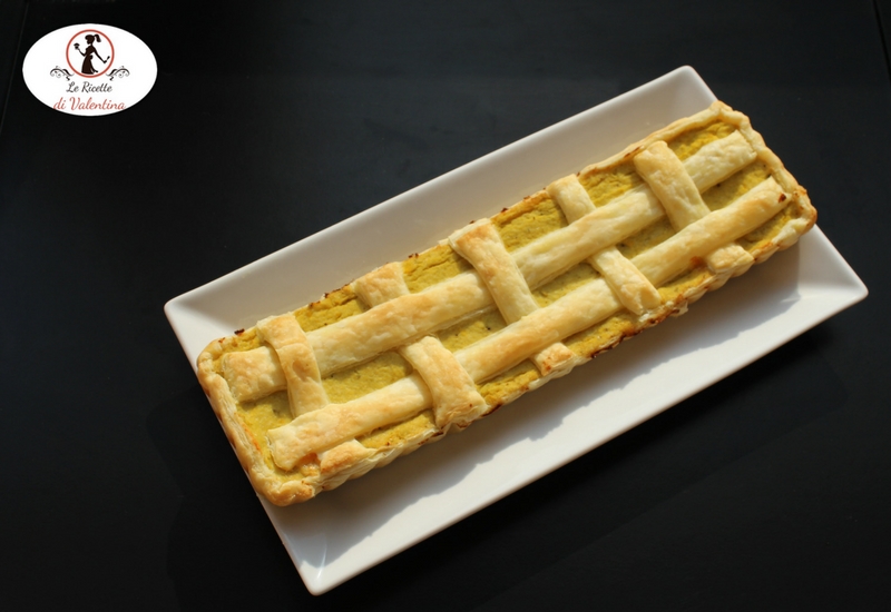 Fate mescolare accuratamente con una spatola le vostre aiutanti; versate la faccia all’interno della pasta sfoglia e livellate bene. Con il rettangolo che avete tenuto da parte di pasta sfoglia tagliate delle strisce è formato un reticolo sulla superficie della torta. Fate aderire bene le estremità delle strisce contro il bordo.