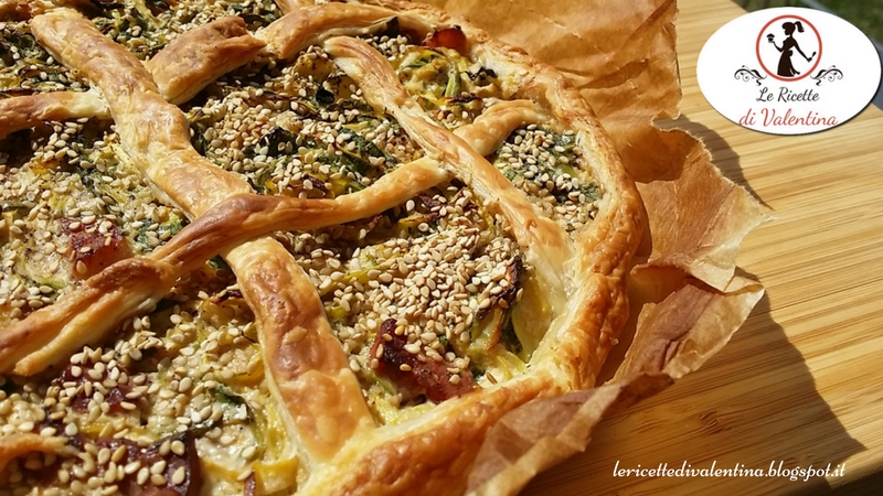 Sistemate sul fondo di essa le zucchine con la pancetta e distribuitele per bene, cospargete tutto di semi di sesamo. Tagliate gli eccessi di pasta sfoglia dal bordo e create una sorta di reticolo decorativo richiudendo e pizzicando il bordo con le dita.