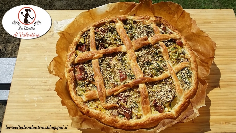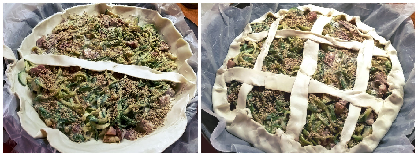 Sistemate sul fondo di essa le zucchine con la pancetta e distribuitele per bene, cospargete tutto di semi di sesamo. Tagliate gli eccessi di pasta sfoglia dal bordo e create una sorta di reticolo decorativo richiudendo e pizzicando il bordo con le dita.