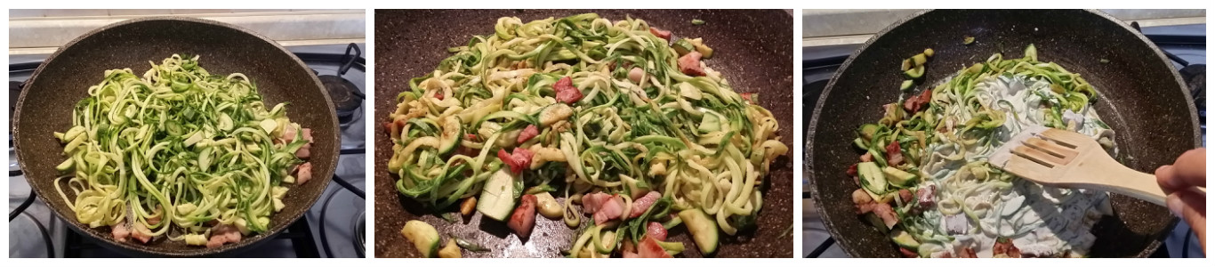 Scaldate l’olio con lo spicchio d’aglio sbucciato, quando comincia a sfrigolare, eliminatelo e tuffate i fili di zucchine, condite con sale e pepe a piacere e fate saltare per un paio di minuti a fiamma vivace, ggiungete la pancetta e procedete la cottura per altri 5 minuti, finchè non comincia a colorarsi. Fuori dal fuoco unite la panna e mescolate per amalgamare i sapori