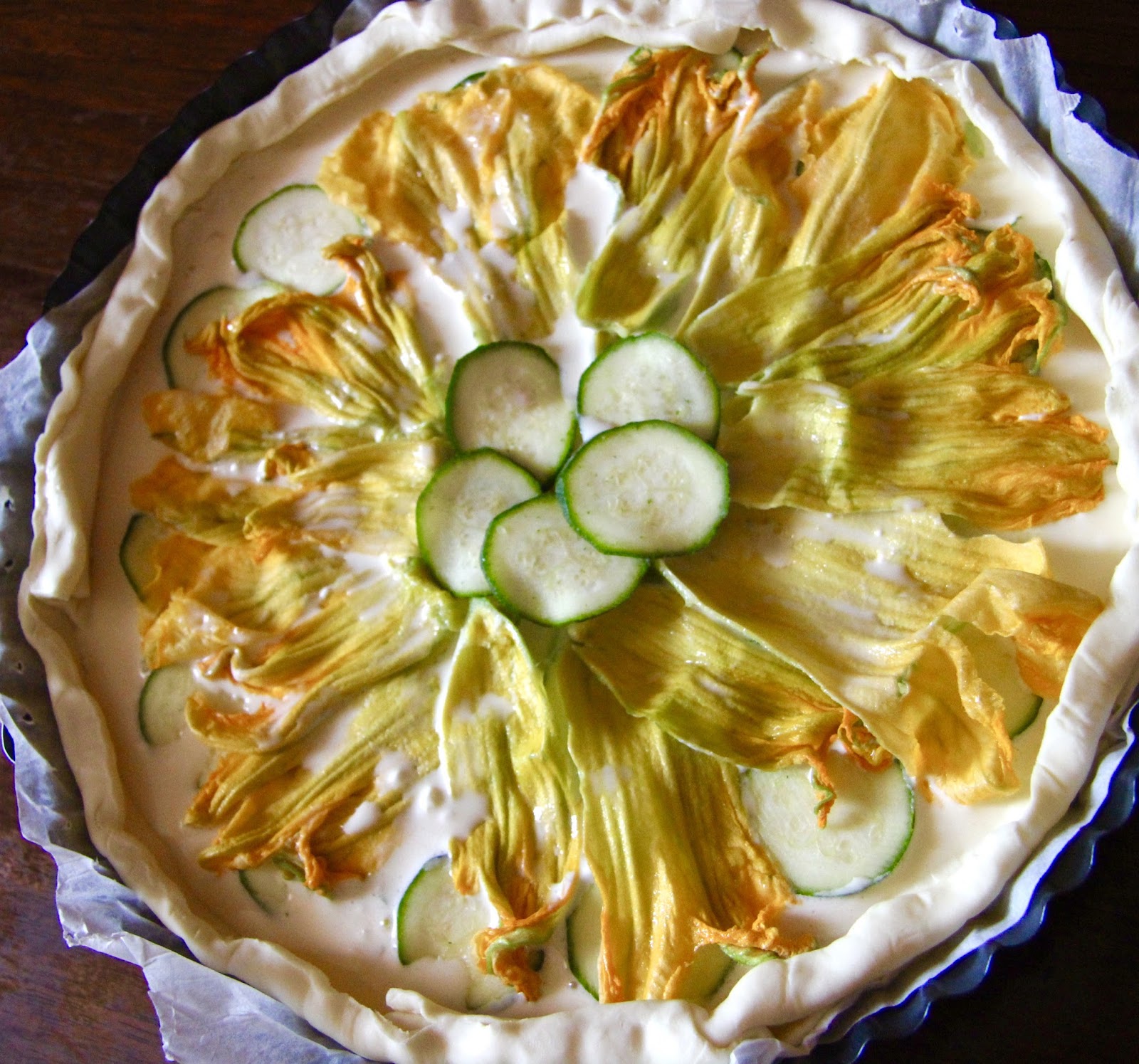 Stendiamo il rotolo di pasta sfoglia in una tortiera, versiamo il composto e infine aggiungiamo le zucchine e poi i fiori.