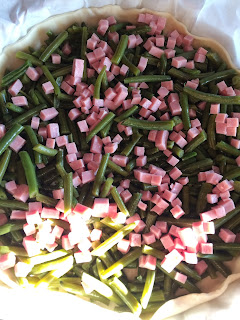 ho messo nella base i fagiolini, il formaggio e 150 gr di prosciutto cotto a cubetti