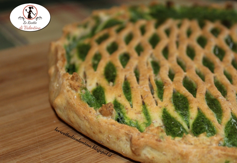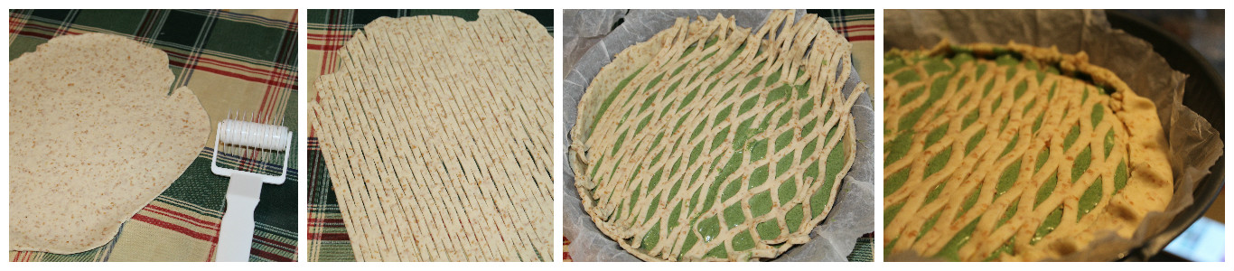 Stendete la pasta di circa mezzo cm di spessore e foderateci una teglia da circa 20-22 cm, la teglia andrà imburrata o ricoperta di carta forno. Ritagliate l’eccesso di pasta dai bordi e forate il fondo con la forchetta, reimpastate gli scarti e stendeteli ancora per creare la decorazione della superficie.