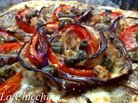 Ora occupiamoci della superficie: alternare fette di melanzana precedentemente grigliate e divise a metà, al pomodoro su cui distribuiremo il tonno sbriciolato e i capperi…continuare fino a coprire del tutto la superficie della torta.