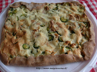 Impastare la sfoglia e lasciarla riposare. Lessare le patate e schiacciarle. In padella scaldare un filo d’olio con lo scalogno tagliato finemente. Aggiungervi le zucchine tagliate a rondelle e lasciarle cuocere per 5 – 6 minuti. Aggiungere un pizzico di sale, un po’ di prezzemolo tagliato fine e le noci spezzettate. Mescolare la farina di ceci con un po’ d’acqua ed aggiungerla alle patate, amalgamare bene. Aggiungere le zucchine e mescolare ancora. Stendere la sfoglia direttamente sulla cartaforno, adagiarla su una tortiera, versarvi la farcia, livellarla e ripiegare i bordi sull’impasto. Cuocere in forno a 180° per 25 minuti.