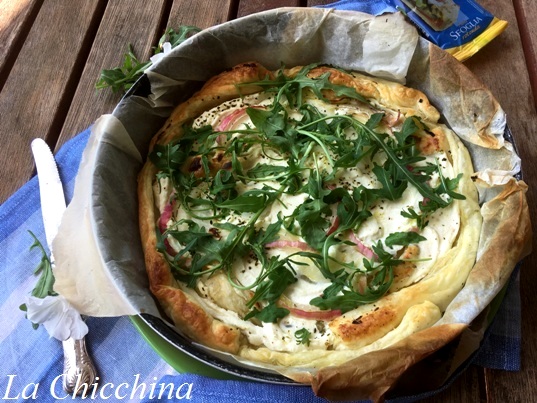 Oggi, devo dire, la dispensa offriva una certa varietà ma la scelta è ricaduta su ricotta, rucola e una bellissima cipolla, la prima della stagione, che da due giorni mi fa l’occhiolino…
