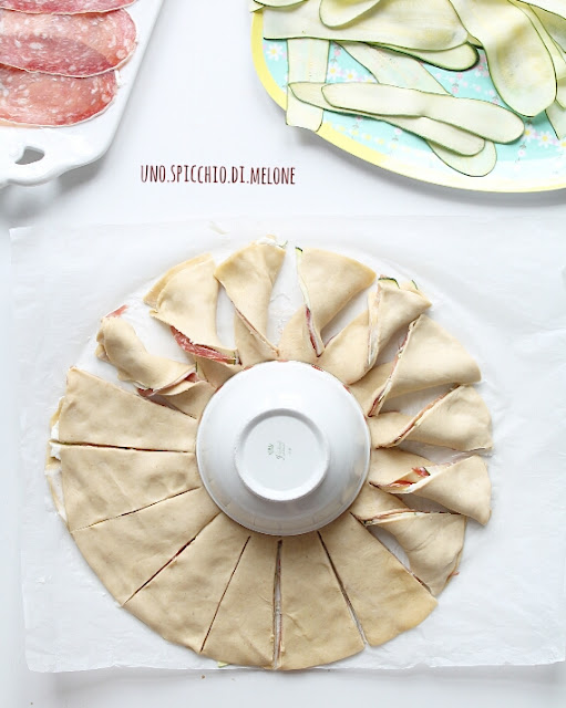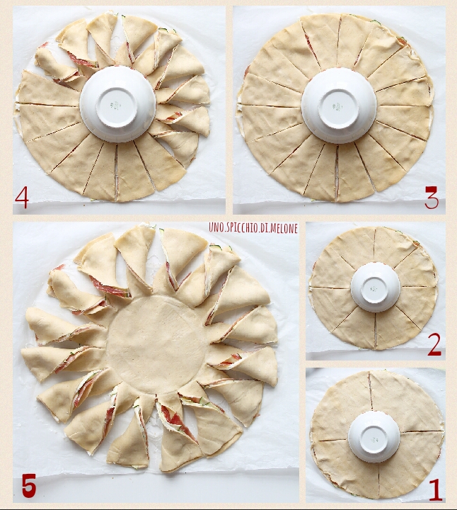 Chiudete con l’altro rotolo di pasta sfoglia e, se volete fare il girasole, seguite questo schema: