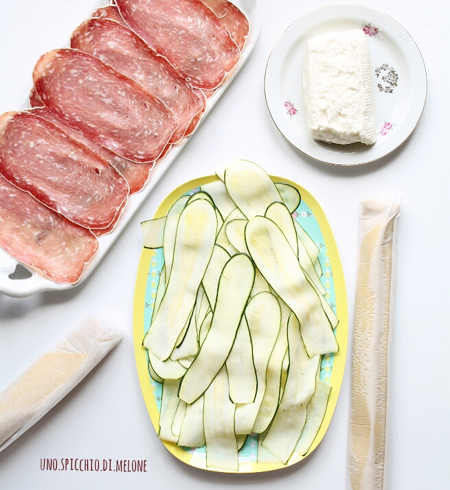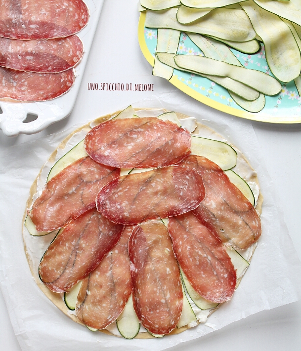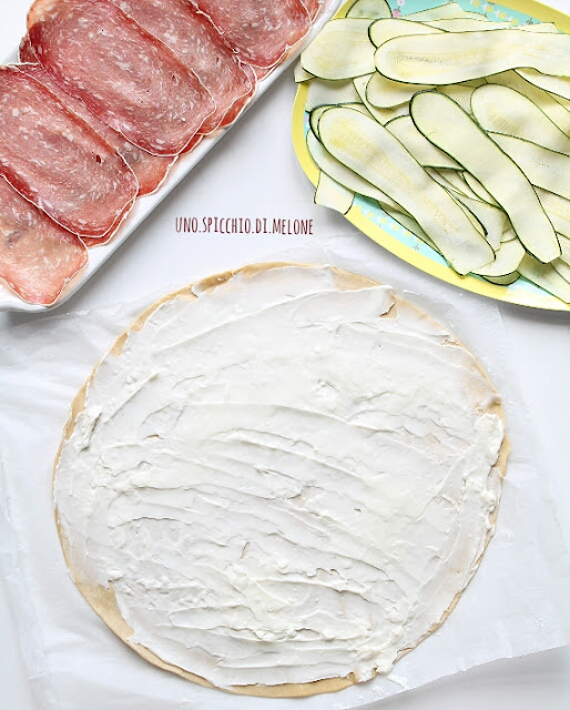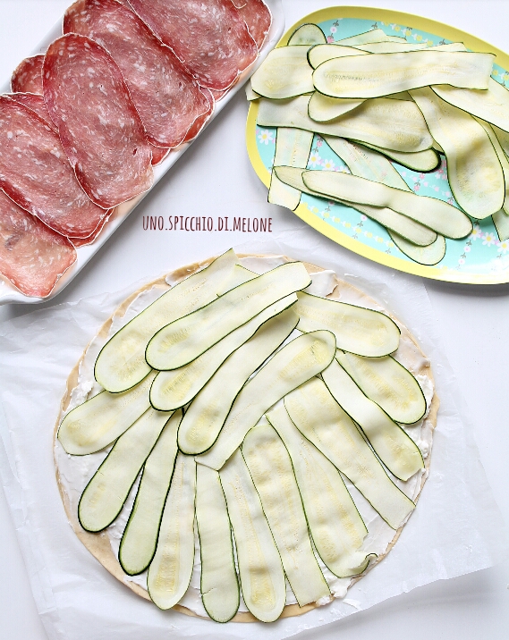 Affettate le zucchine (se ce l’avete, con l’affettatrice). Stendete il primo rotolo di pasta sfoglia e spalmate in modo omogeneo lo stracchino.