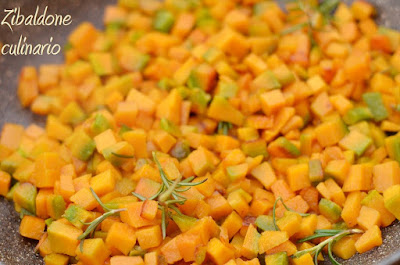 Tagliare a cubetti la zucca, saltarla in padella con olio e rosmarino. Far raffreddare.