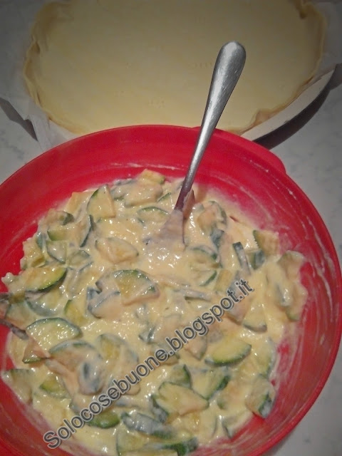 In una ciotola mescoliamo la ricotta con le uova ed il formaggio. Uniamo le zucchine tiepide e la mozzarella a dadini.