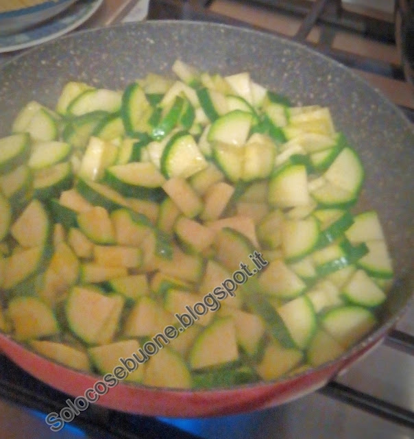 Laviamo le zucchine e tagliamole in piccoli pezzi. Facciamo soffriggere lo scalogno in poco olio, saliamo e cuociamo per circa 5 minuti: devono restare leggermente croccanti.