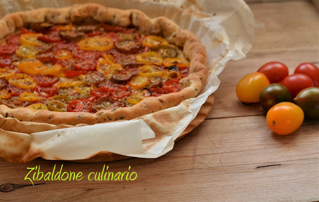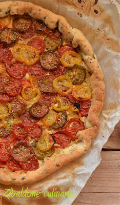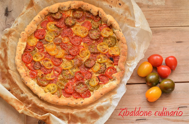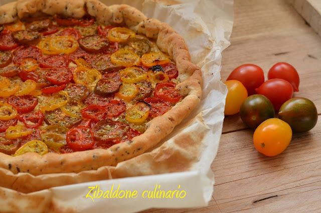 Questa torta salata semplice ma molto gustosa l’ho già preparata diverse volte grazie alla mia produzione di pomodorini colorati che quest’anno è davvero esagerata. La ricetta viene dal gruppo Il club del 27, tratta dal libro “The roasting tin” di Rukmini Yver, uscito qualche anno fa ma che rimane un punto di riferimento per “il cotto in forno”, pubblicazione molto interessante e che consiglio vivamente nella biblioteca culinaria.