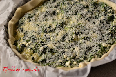 Foderare una teglia con carta forno, ricoprire con la pasta sfoglia, distribuire la farcia sull’impasto dopo averlo forato con una forchetta. Spolverizzare ancora un paio di cucchiai di Parmigiano grattugiato.