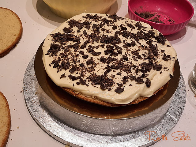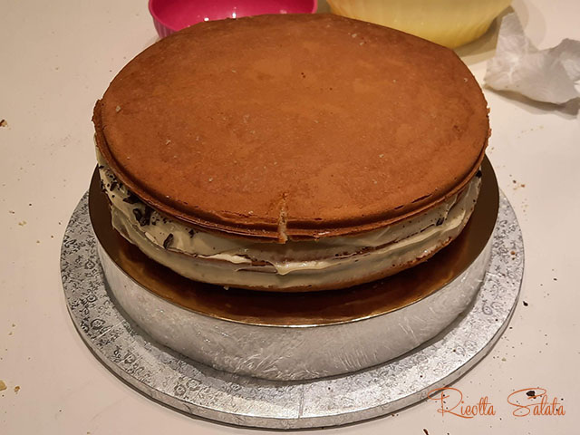 Tagliare il pan di spagna in 3 dischi uguali. Per rendere la torta più ‘scenica’, ho proceduto all’assemblaggio poggiando il primo disco su un vassoio, al di sopra di una base di polistirolo.