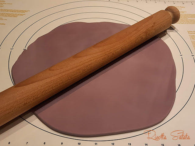Velare di zucchero a velo il piano di lavoro e il mattarello, appoggiare il panetto di glassa fondente sul piano di lavoro e cominciare a tirare col mattarello fino ad ottenere uno spessore di circa 2 mm.