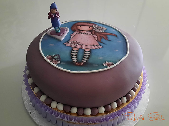 Srotolarla dal mattarello e con le mani e far aderire lo strato di zucchero alla torta, ritagliando la pasta in eccesso. Sistemare la cialda sulla torta e aggiungere le decorazioni come più vi piace. Io per esempio ho realizzato un cordoncino di pasta di zucchero bianca per fare la cornice alla cialda, sistemata la bambolina su una base a forma di cuore e realizzato delle palline da mettere alla base della torta, alternandone il colore.