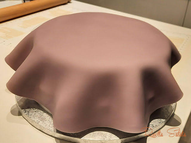 Quando la sfoglia di zucchero è pronta, arrotolarla sul mattarello e trasportarla sulla torta.