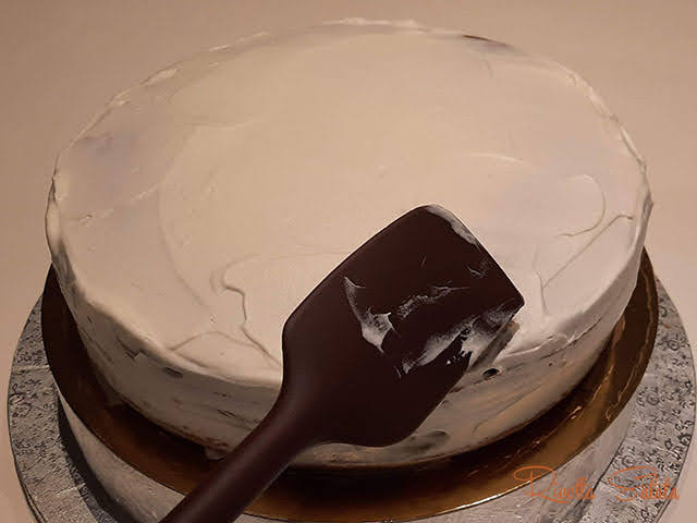 Riprendere la torta dal frigo il mattino dopo e ricoprire la superficie e i lati della torta con un sottile strato di panna montata che servirà per farvi aderire la pasta di zucchero.