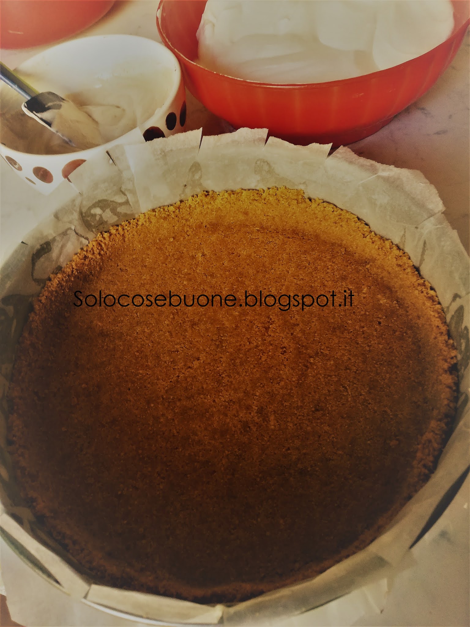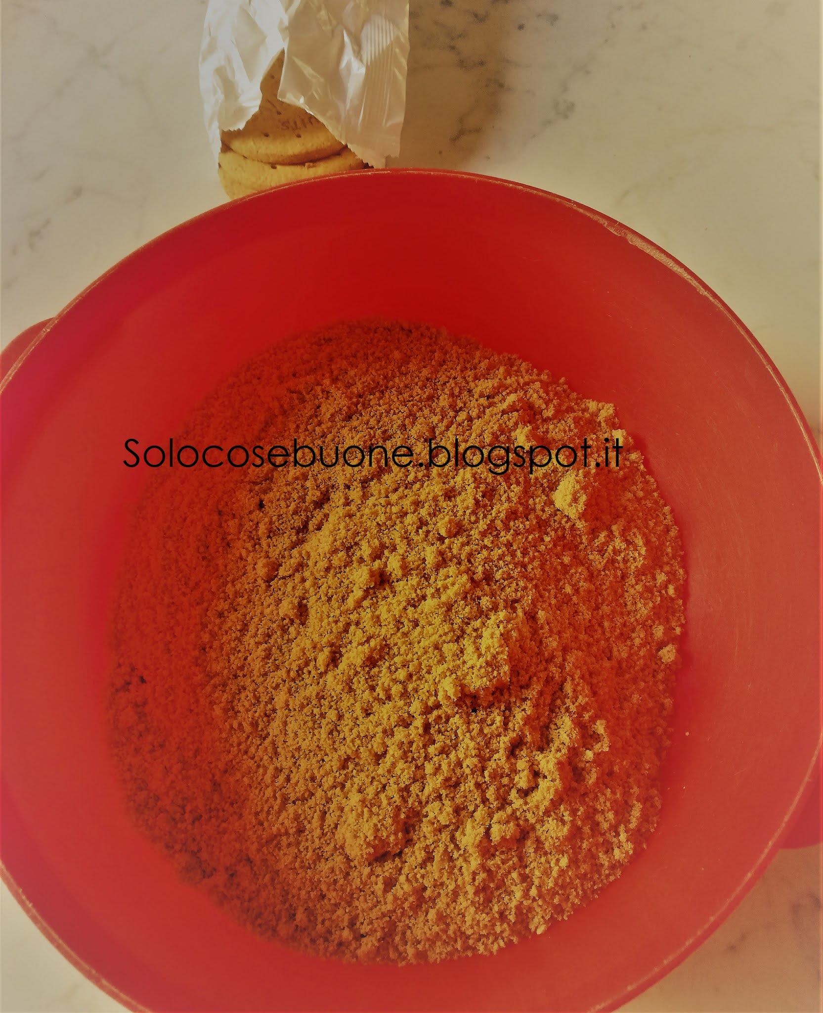 Prima di iniziare la preparazione della torta semifreddo cornetto Algida dobbiamo foderare una tortiera del diametro di 24 cm con della pellicola trasparente oppure con carta forno. Spezzettiamo i biscotti mettendoli in un mixer e frulliamo fino a polverizzarli.