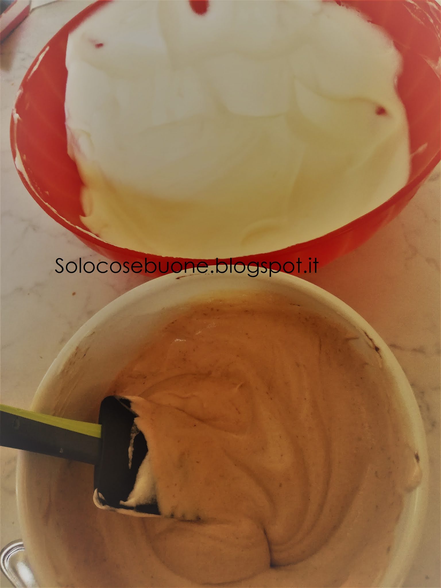 Montiamo la panna, aggiungiamo il latte condensato e mescoliamo delicatamente. Dividiamo la crema in due ciotole e in una aggiungiamo la nutella.