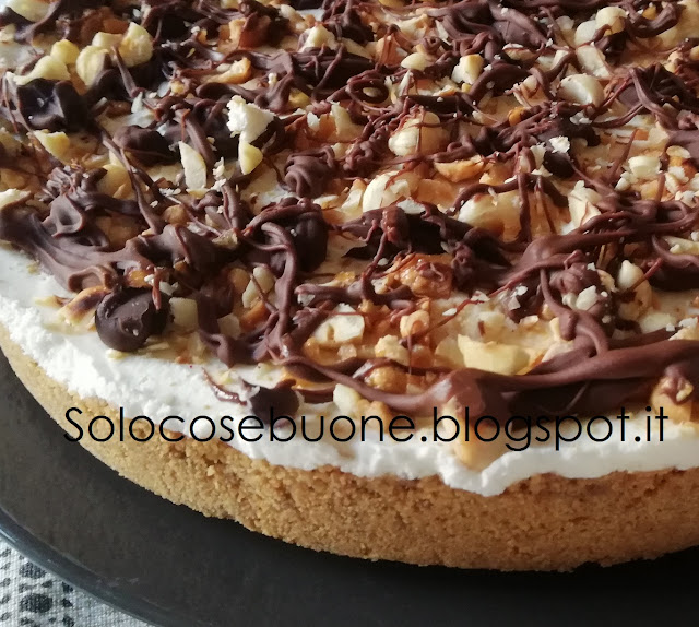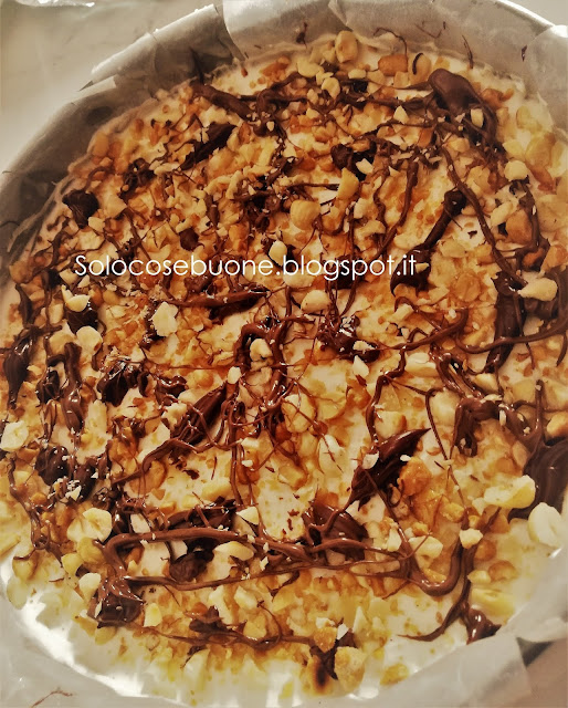 Tostiamo le nocciole e tritiamole grossolanamente. Riprendiamo la torta, decoriamola con il cioccolato fuso , le nocciole e la nutella.