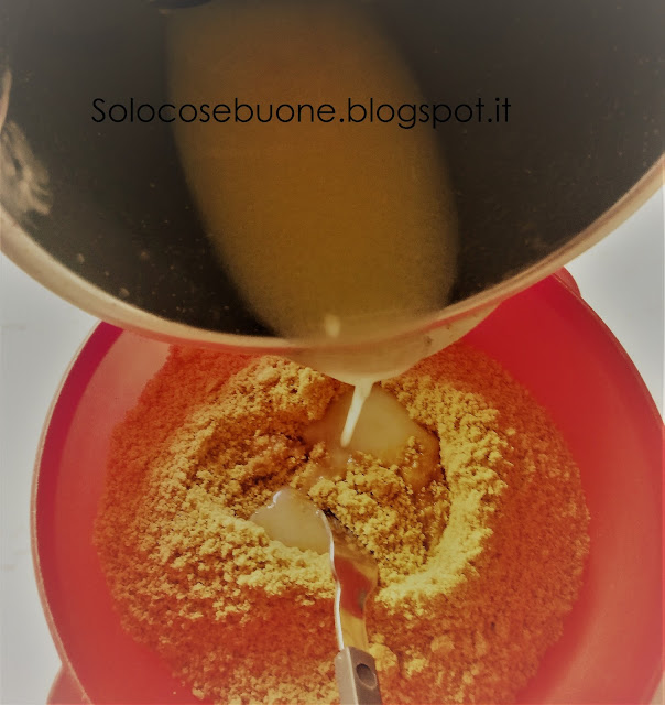 Nel frattempo facciamo sciogliere il burro, mescoliamo i due ingredienti all’interno di una ciotola fino ad ottenere un composto simile alla sabbia.