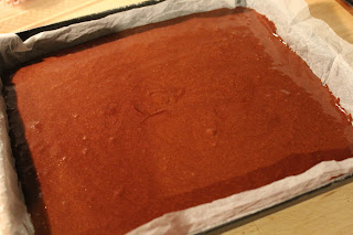 Foderare una tortiera (io 25×20) con carta forno leggermente inumidita e versarvi l’impasto.