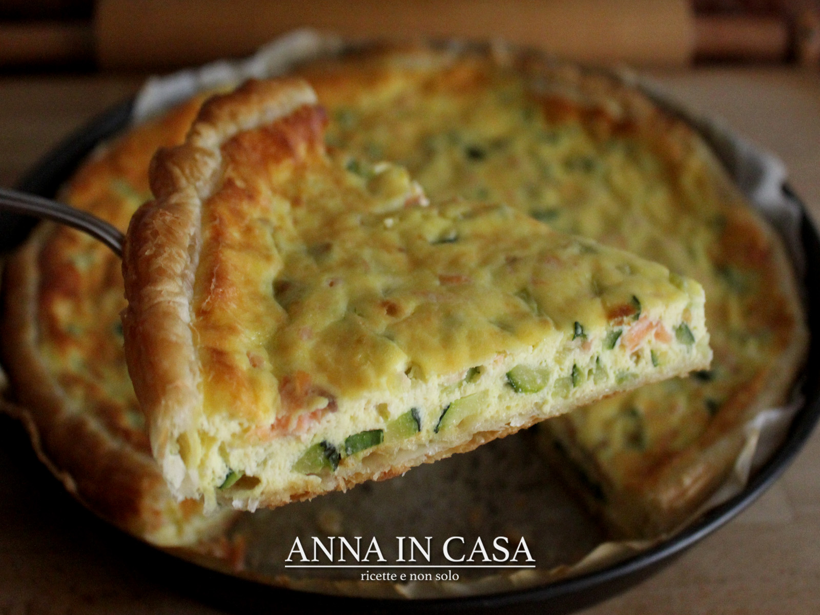 Nel frattempo scaldare il forno a 200°C e foderare una tortiera con la pasta sfoglia, utilizzando la carta forno fornita nella confezione.