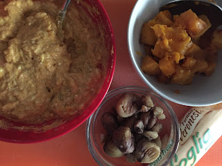 Unire le castagne grossolanamente tagliate a pezzetti e i pezzi di zucca tenuti da parte.