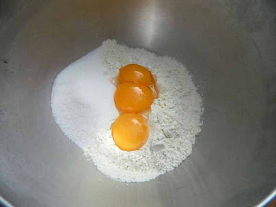 Prepariamo la frolla, mettendo nella ciotola dell’impastatrice o a mano la farina, lo zucchero, i rossi d’uova, il cucchiaino di bicarbonato,